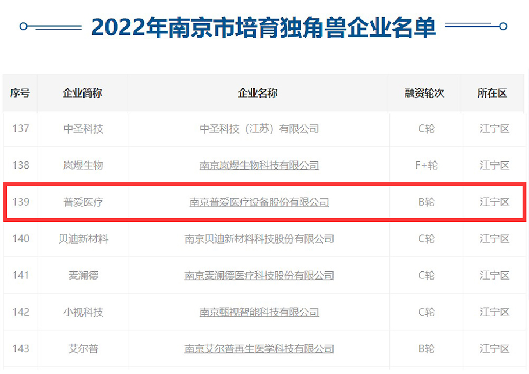 普愛醫(yī)療入選2022年度南京市培育獨角獸企業(yè)名單