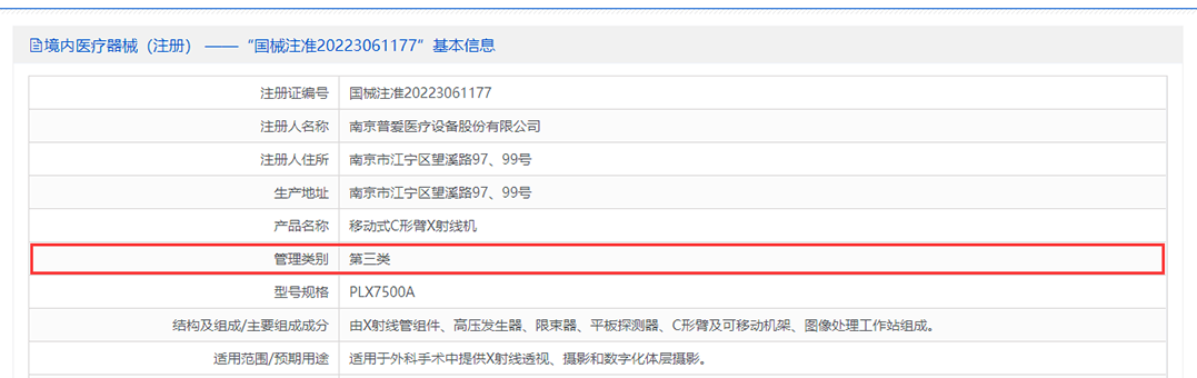 《醫(yī)療器械分類目錄》中,“移動(dòng)式C形臂X射線機(jī)”品類,帶有“數(shù)字化體層攝影“功能的C形臂按III三類注冊證管理,其它用于外科手術(shù)透視及攝影,獲得影像供臨床診斷用的C形臂歸屬II二類注冊證管理。普愛醫(yī)療平板三維C形臂已取得三類醫(yī)療器械注冊證。